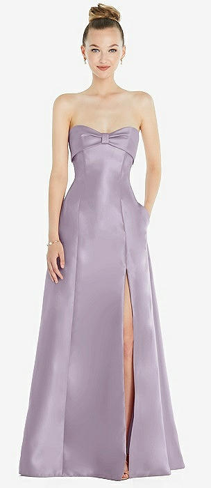 Bow Cuff Strapless Satin Ball Gown with Pockets in lilac haze