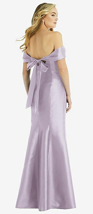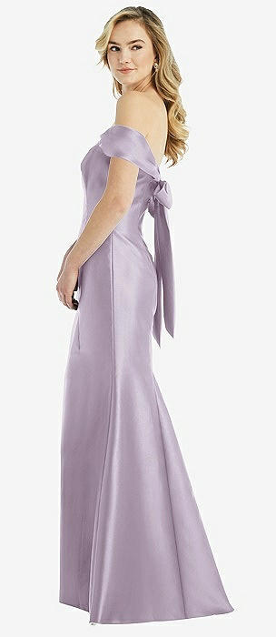 Off-the-Shoulder Bow-Back Satin Trumpet Gown in lilac haze