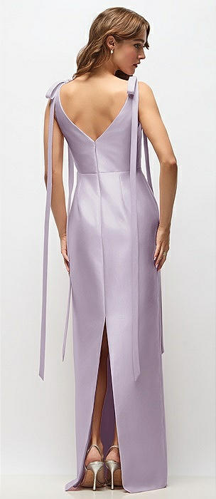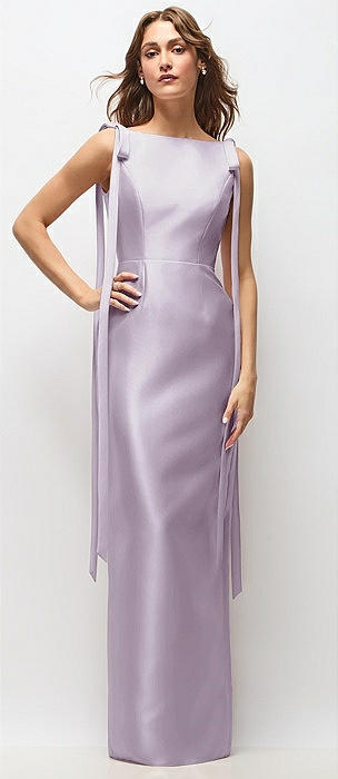 Bateau Neck Satin Column Maxi Dress with Exaggerated Tail Bow Straps in lilac haze