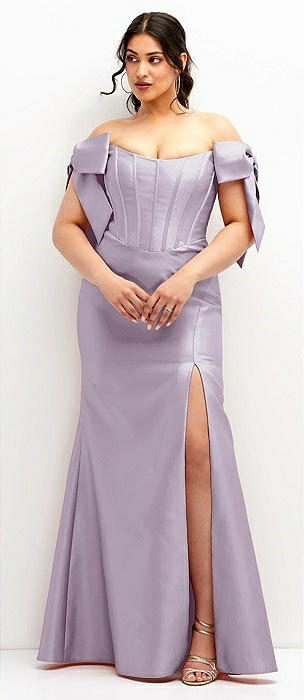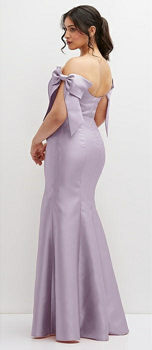Off-the-Shoulder Bow-Back Satin Trumpet Gown in lilac haze