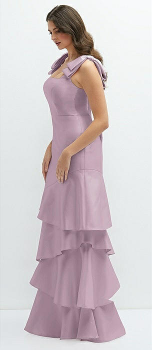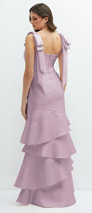 Bow-Shoulder Satin Maxi Dress with Asymmetrical Tiered Skirt in suede rose