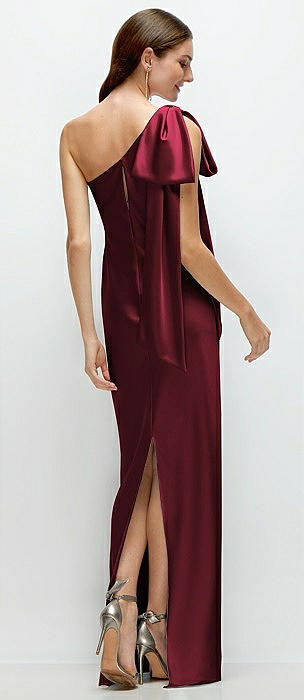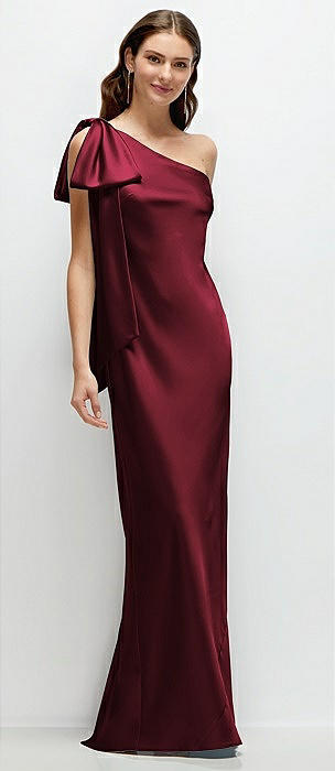 One-Shoulder Bias-Cut Satin Maxi Dress with Cascading Shoulder Bow in cabernet