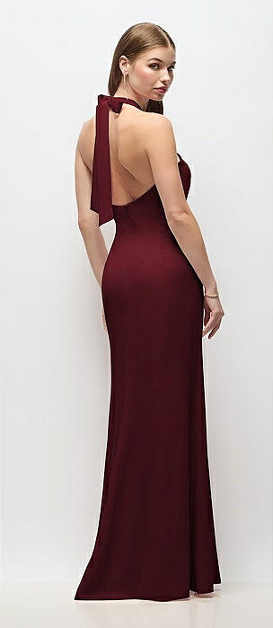 Plunge Halter Open-Back Maxi Bias Dress with Low Tie Back in cabernet