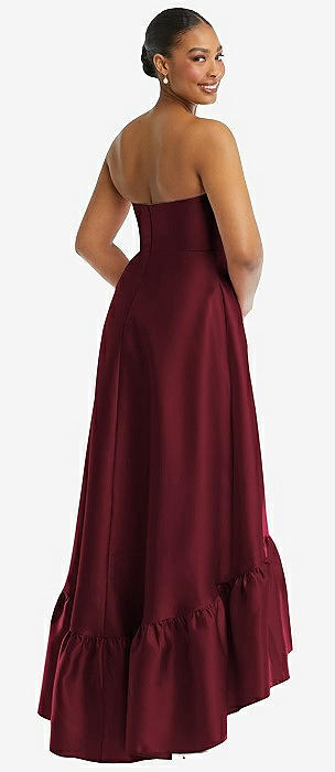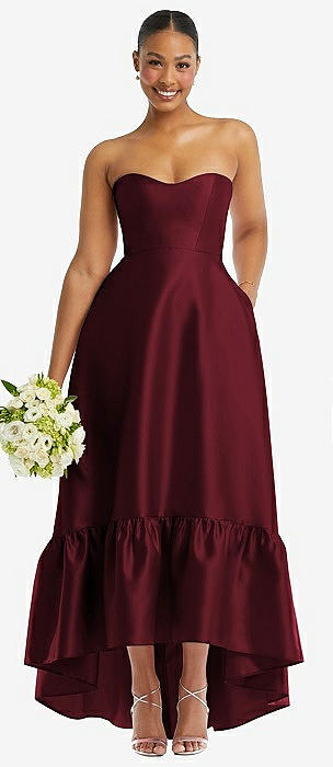 Strapless Deep Ruffle Hem Satin High Low Dress with Pockets in cabernet