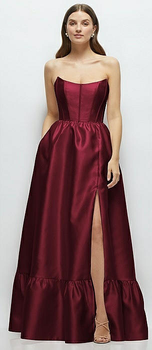 Strapless Cat-Eye Boned Bodice Maxi Dress with Ruffle Hem in cabernet