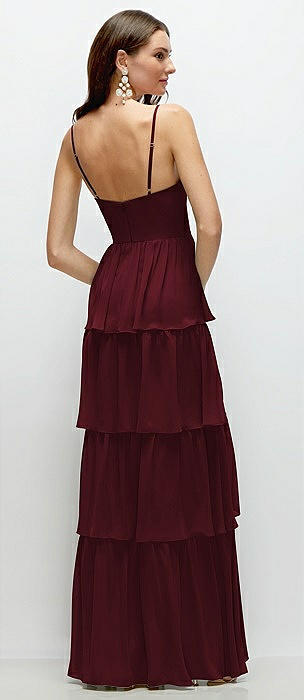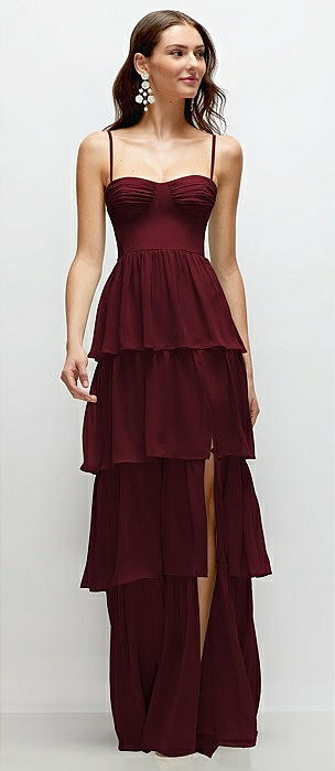 Bustier-Style Chiffon Tiered Ruffle Maxi Dress with Adjustable Straps in cabernet