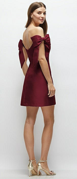 Satin Off-the-Shoulder Bow Corset Fit and Flare Mini Dress in cabernet
