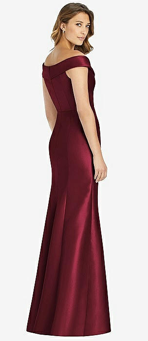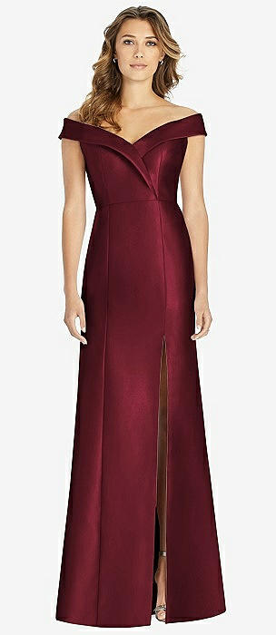 Off-the-Shoulder Cuff Trumpet Gown with Front Slit in cabernet