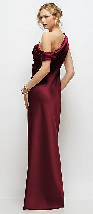 Basque-Neck A-Line Stretch Satin Maxi Dress with Off-the-Shoulder Drape in cabernet
