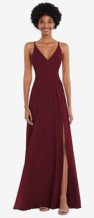 Wrap Bodice Chiffon Maxi Dress with Adjustable Spaghetti Straps in cabernet