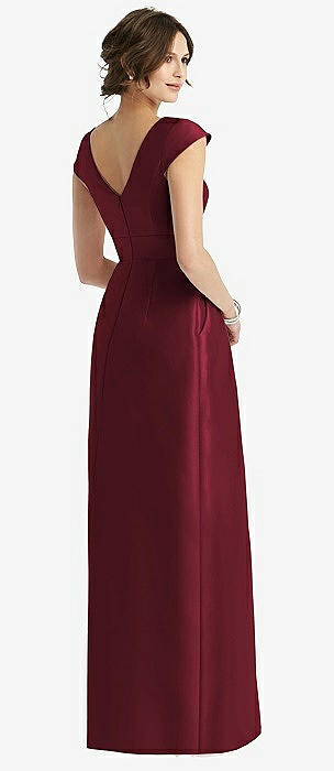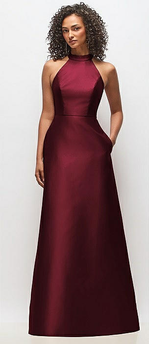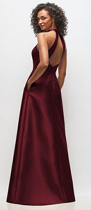 Open Neckline Cutout Satin Twill A-Line Gown with Pockets in cabernet