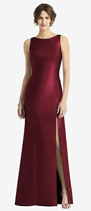 Jewel Neck Bowed Open-Back Trumpet Dress with Front Slit in cabernet