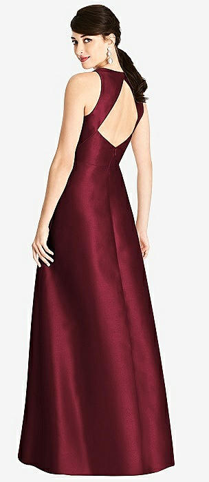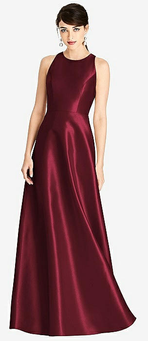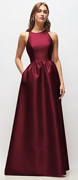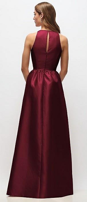 Jewel Neck Halter Full A-Line Satin Maxi Dress in cabernet