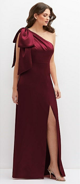 Bow One-Shoulder Satin Maxi Dress with Trumpet Skirt in cabernet
