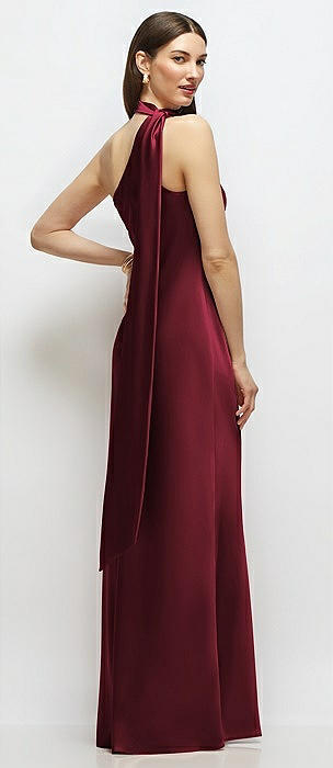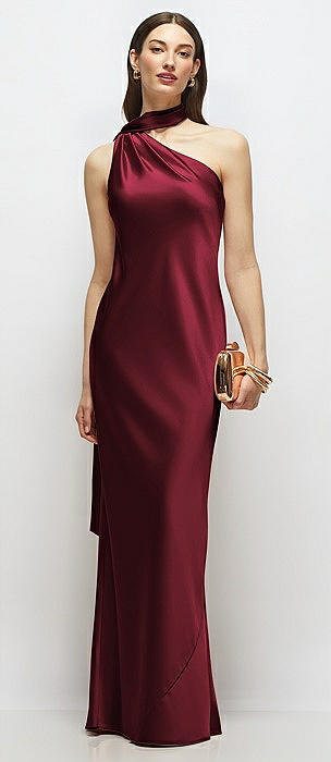 Draped Scarf One-Shoulder Bias Stretch Satin Maxi Dress in cabernet