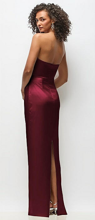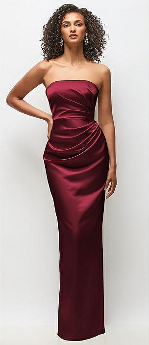 Strapless Draped Bodice Stretch Satin Column Maxi Dress in cabernet