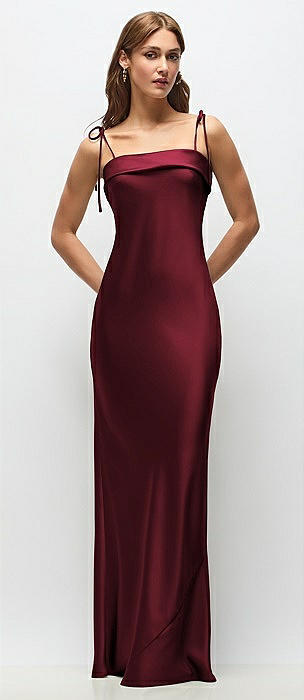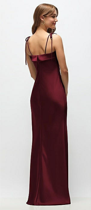Cuff Neck Satin Bias Maxi Dress with Self-Tie Spaghetti Straps in cabernet