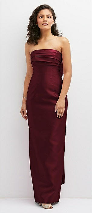 Strapless Cuff Satin Maxi Dress with Column Skirt & Back Bow in cabernet