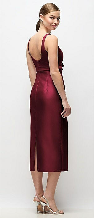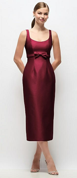 Scoop Neck Satin Column Midi Dress with Bow at Empire Waist in cabernet
