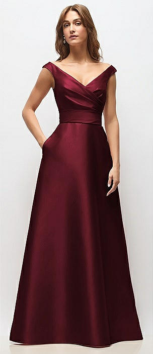 Off-the-Shoulder Draped Wrap Satin Maxi Dress in cabernet