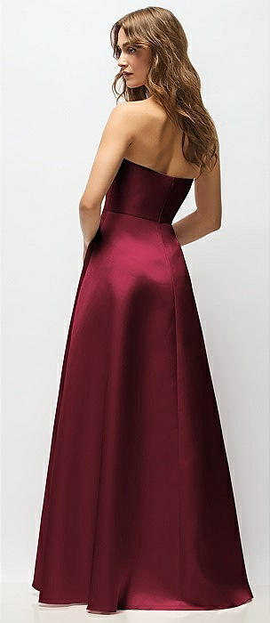 Strapless Satin Gown with Full Skirt and Covered Buttons at Back in cabernet