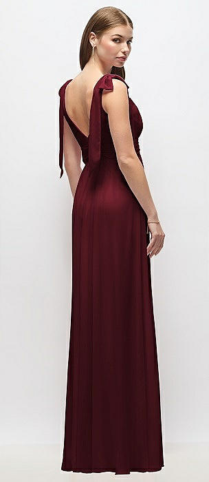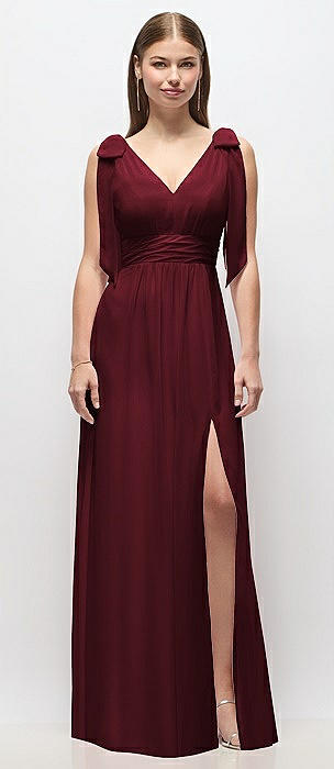 Plunge Neckline Bow Shoulder Empire Waist Chiffon Maxi Dress in cabernet