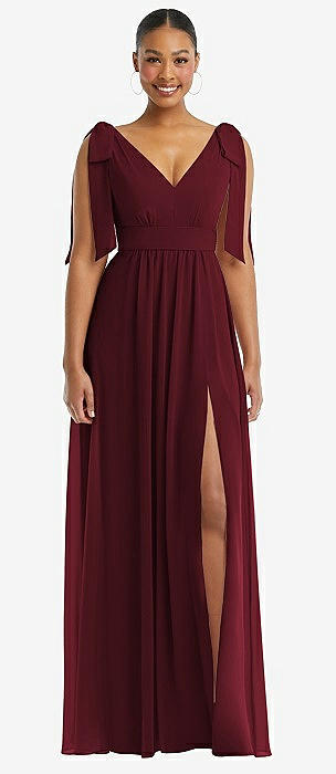 Plunge Neckline Bow Shoulder Empire Waist Chiffon Maxi Dress in cabernet