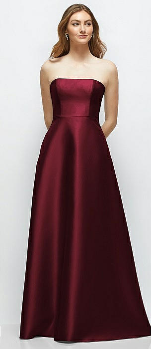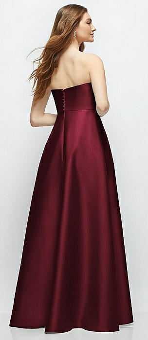 Strapless Satin Gown with Full Skirt and Covered Buttons at Back in cabernet