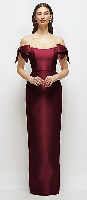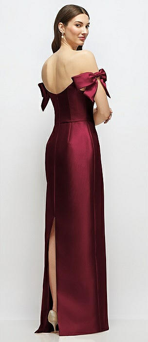 Basque-Neck Satin Column Maxi Dress with Off-the-Shoulder Bows in cabernet