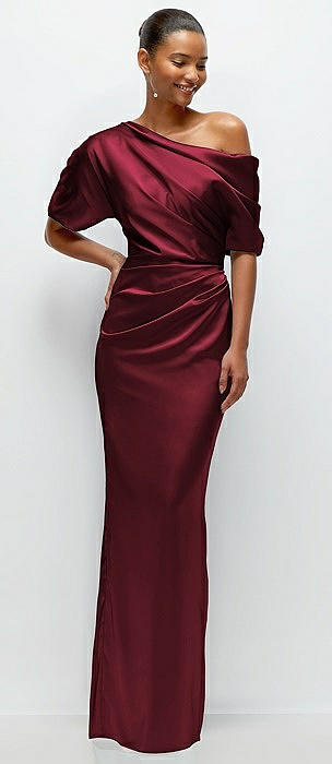 Asymmetrical Off-the-Shoulder Pleated Satin Maxi Dress in cabernet