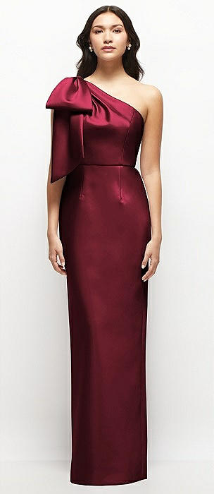 Oversized Bow One-Shoulder Satin Column Maxi Dress in cabernet