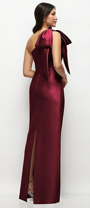 Deep V-back Satin Trumpet Dress with Cascading Bow at One Shoulder in cabernet
