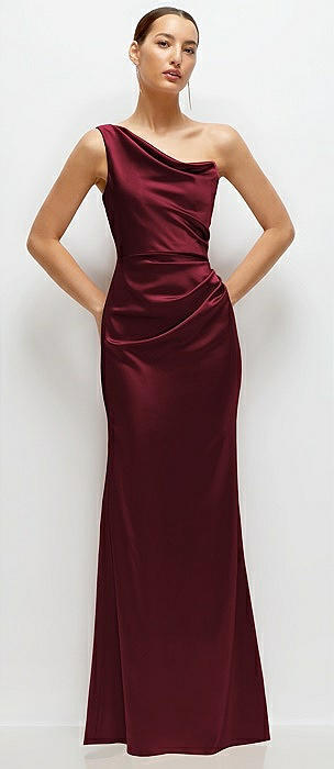 One-Shoulder Draped Cowl A-Line Satin Maxi Dress in cabernet