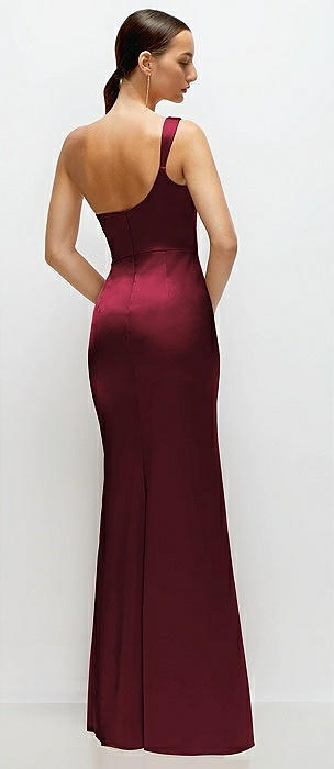 One-Shoulder Cat-Eye Neckline Fit and Flare Satin Maxi Dress in cabernet