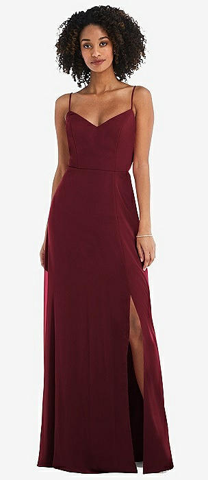 Spaghetti Strap Draped Skirt Gown with Front Slit in cabernet