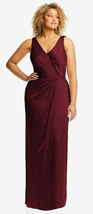 Faux Wrap Whisper Satin Maxi Dress with Draped Tulip Skirt in cabernet
