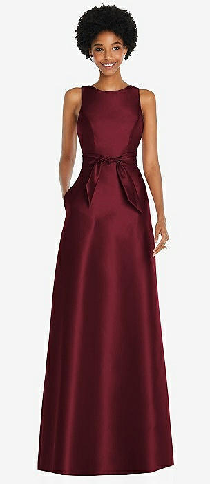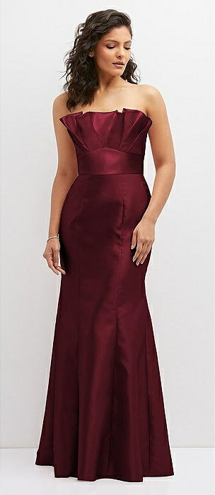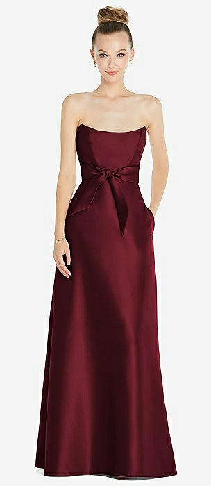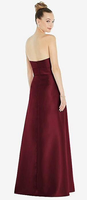 Basque-Neck Strapless Satin Gown with Mini Sash in cabernet