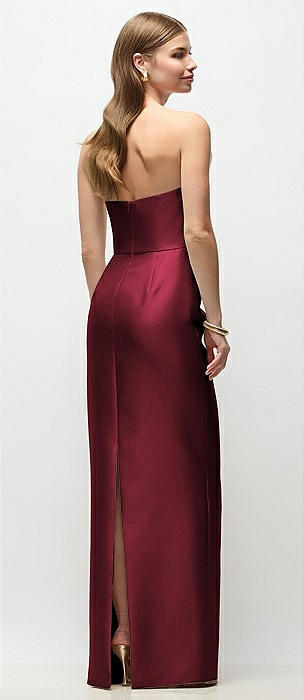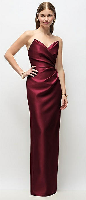 Strapless Asymmetrical Draped Satin Column Maxi Dress in cabernet