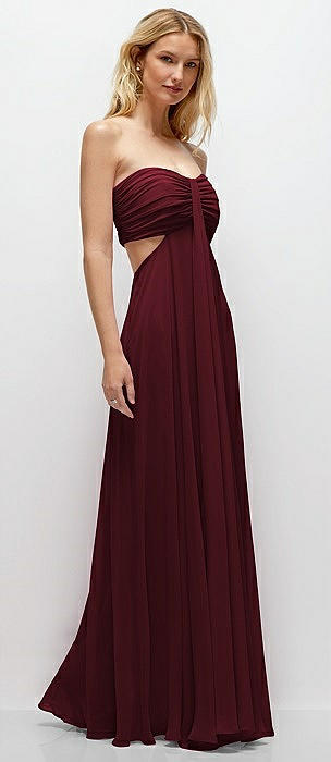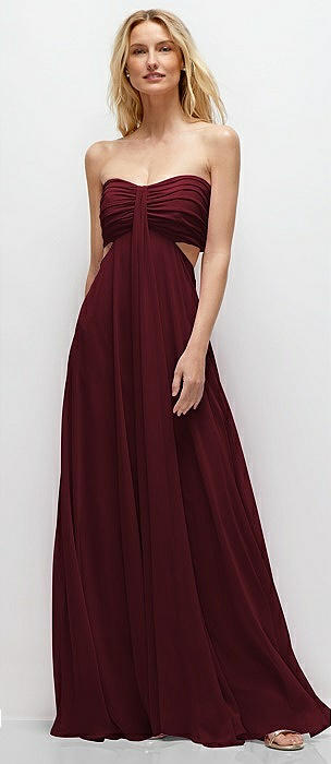 Strapless Empire Waist Cutout Maxi Dress with Covered Button Detail in cabernet