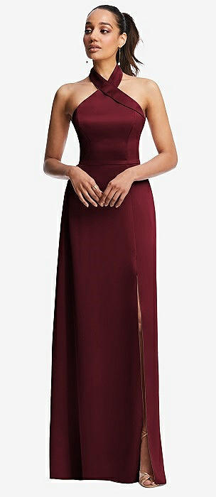Stand Collar Halter Maxi Dress with Criss Cross Open-Back in cabernet