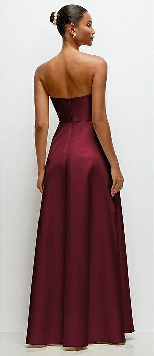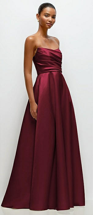 Strapless Draped Cat-Eye Satin Maxi Dress with Full Skirt in cabernet