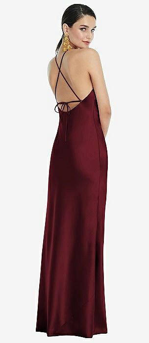 High Halter Tie-Strap Open-Back Satin Maxi Dress in cabernet