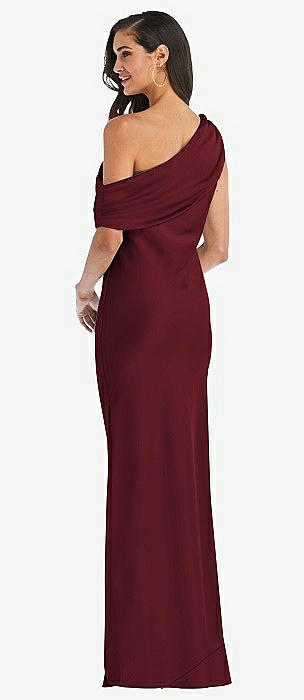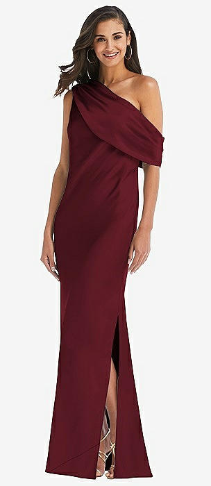Asymmetrical One-Shoulder Cowl Maxi Slip Dress in cabernet