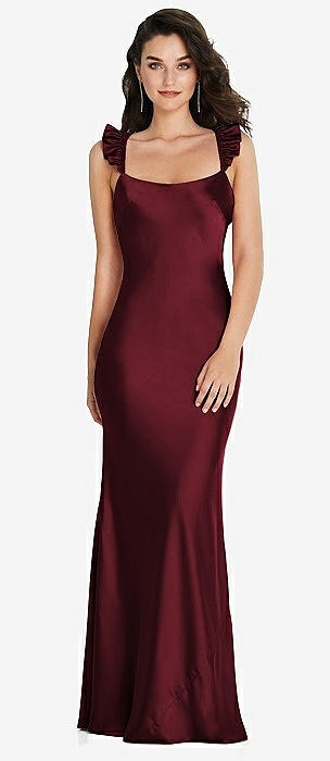 Ruffle Trimmed Open-Back Maxi Slip Dress in cabernet