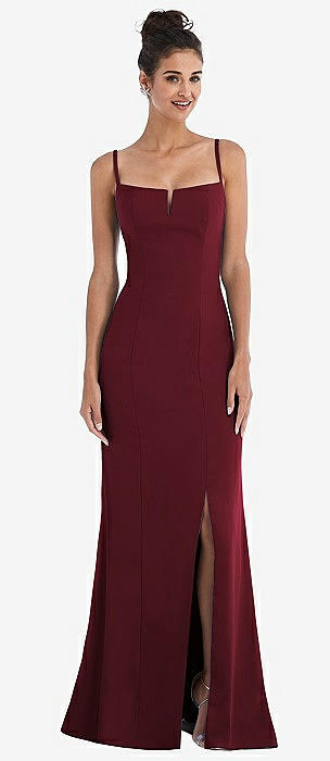 Notch Crepe Trumpet Gown with Front Slit in cabernet