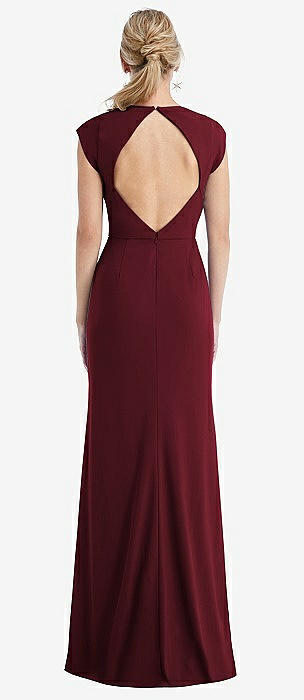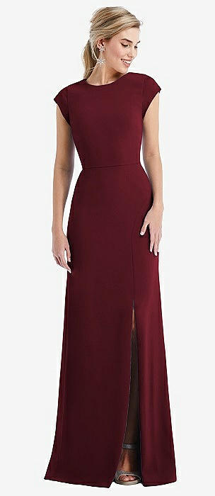 Cap Sleeve Open-Back Trumpet Gown with Front Slit in cabernet
