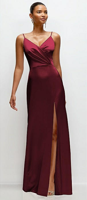Pleated Faux Wrap Satin Maxi Dress with Adjustable Spaghetti Straps in cabernet
