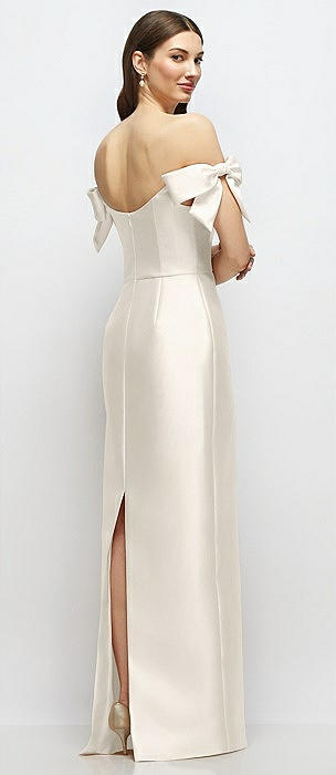 Basque-Neck Satin Column Maxi Dress with Off-the-Shoulder Bows in ivory