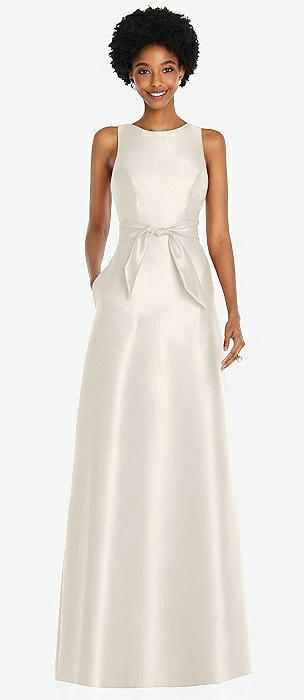 Square Neck Satin Midi Dress with Full Skirt & Flower Sash in ivory