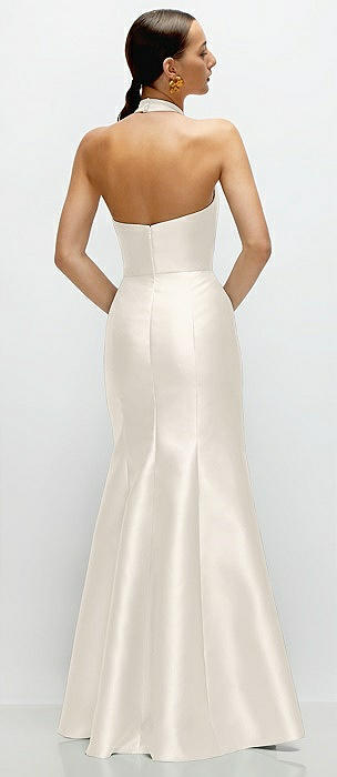 High-Neck Halter Open-Back Satin Trumpet Dress in ivory